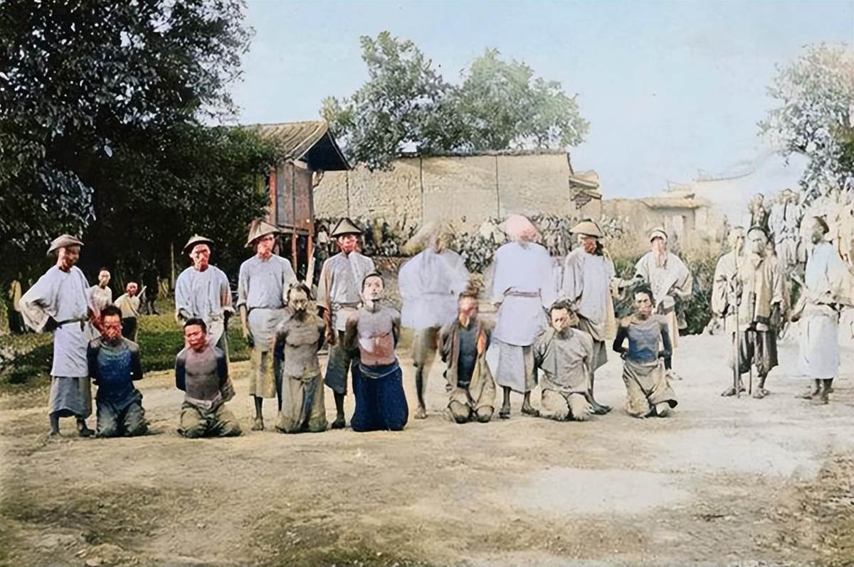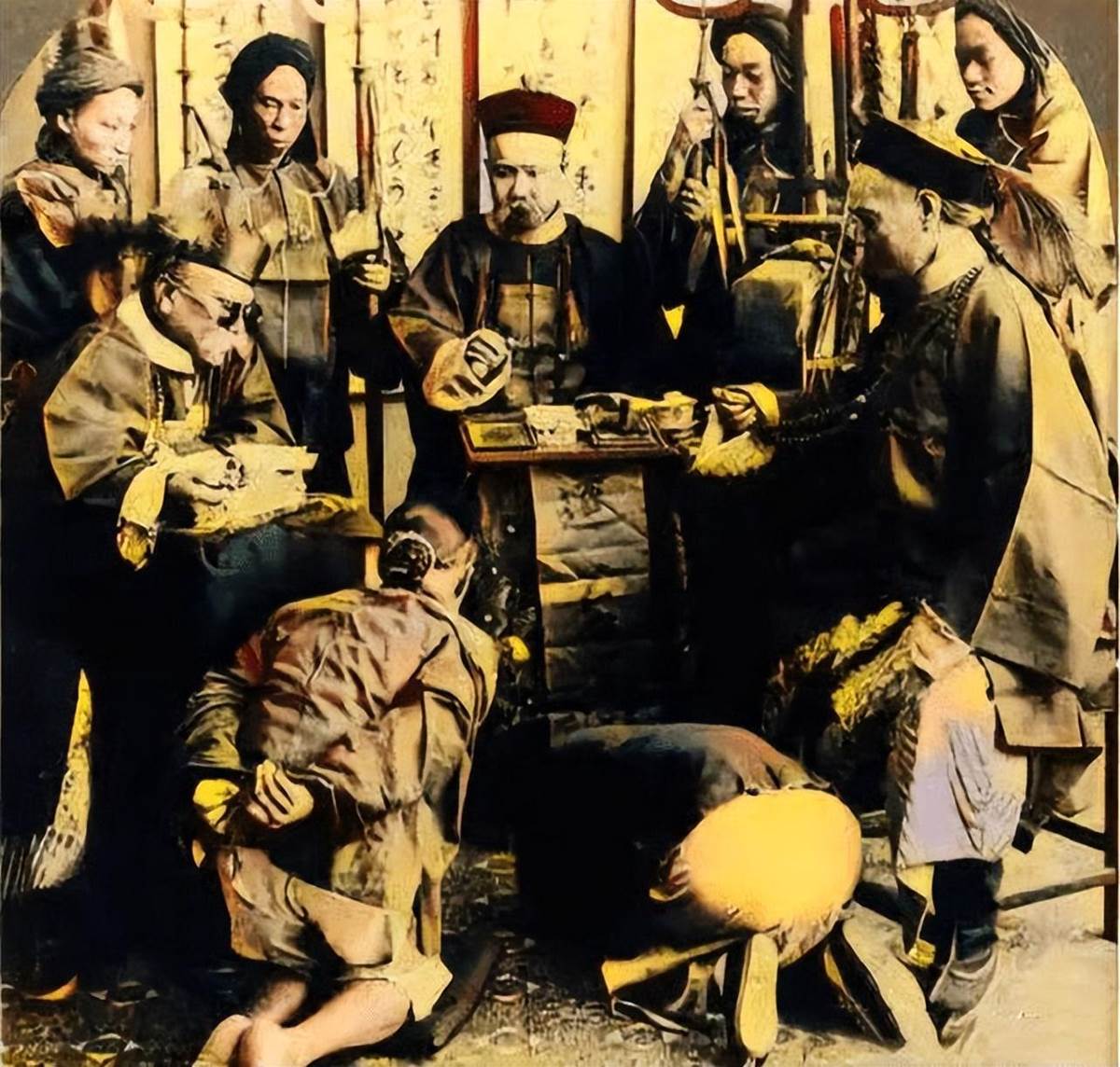 清末衙門審案子的場景,兩個犯人一趴一跪,沒有敢抬頭的,可見犯事之人對官員多麼畏懼。官老爺高高在上,對著犯人指手畫腳。師爺戴著墨鏡,趨炎附勢。審案的桌子也就巴掌大,夠寒酸的,和電視劇里大不一樣。