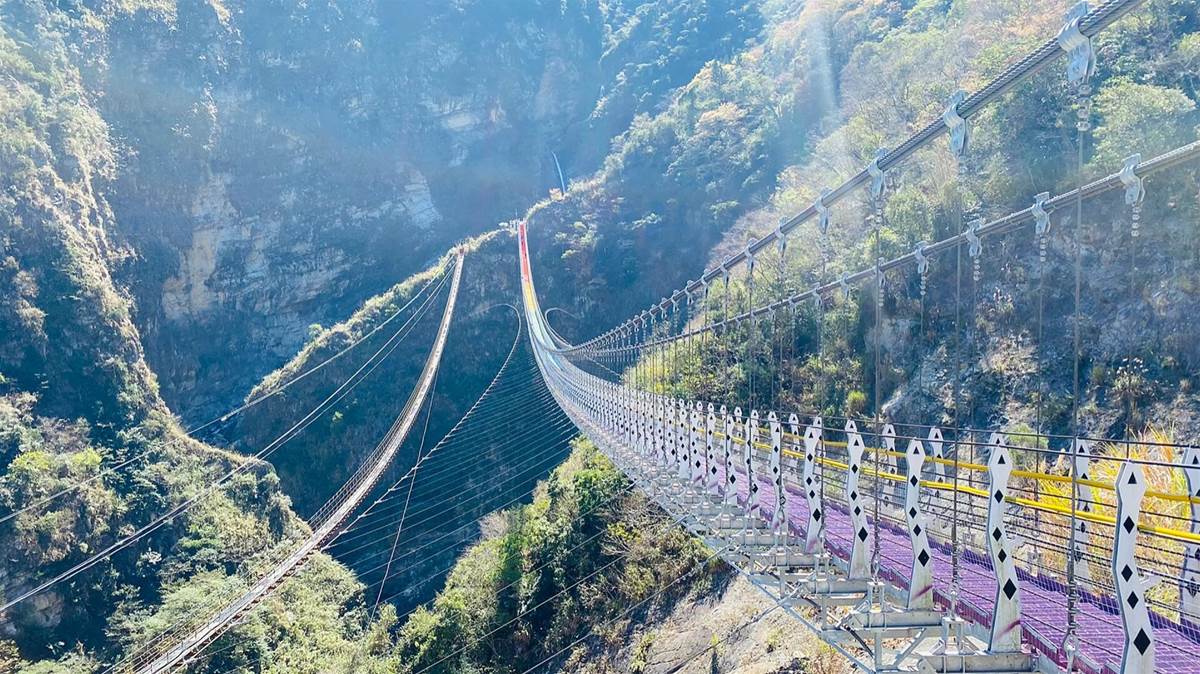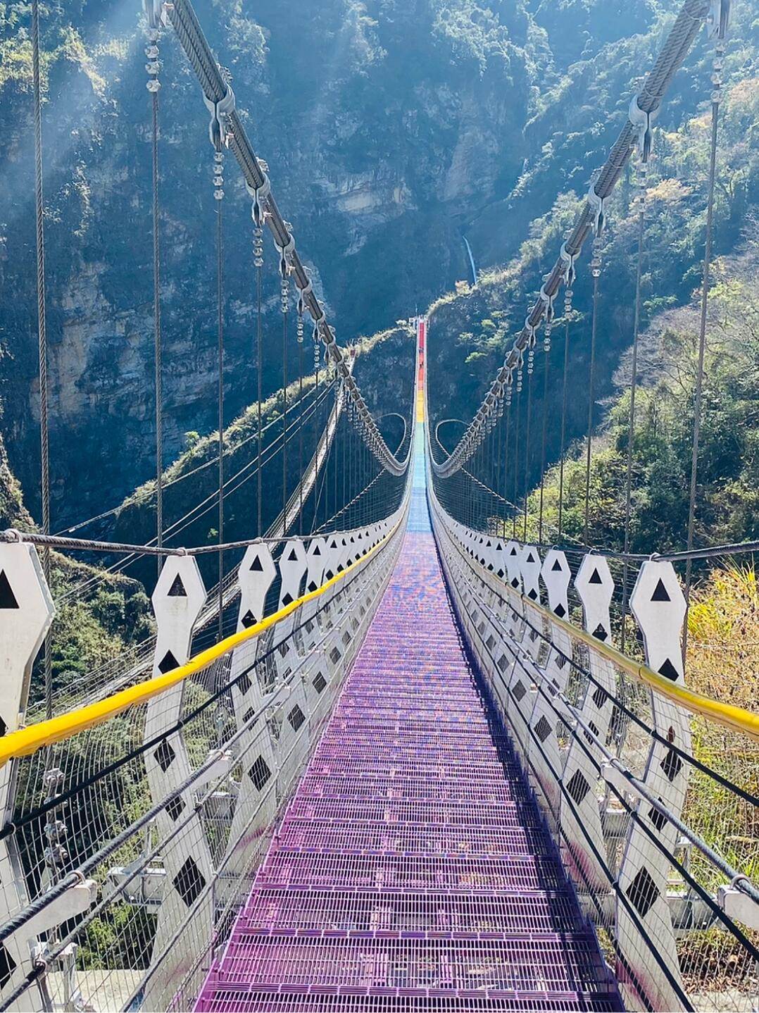 漫步在雙龍瀑布彩虹吊橋上,仿佛置身仙境。這座架在懸崖峭壁上的吊橋,連接著兩座山峰之間,讓人有種身臨其境的感受。