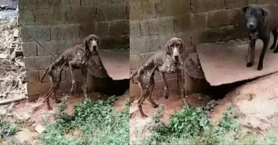 一位男子在路過一個廢棄的庭院時發現了這樣一幕:一隻身上只剩下一副骨架的狗狗被拴在了牆角,而它的旁邊還站著一條流浪狗,這一幕讓男子感到非常痛心!覺得它們實在是太可憐了吧!