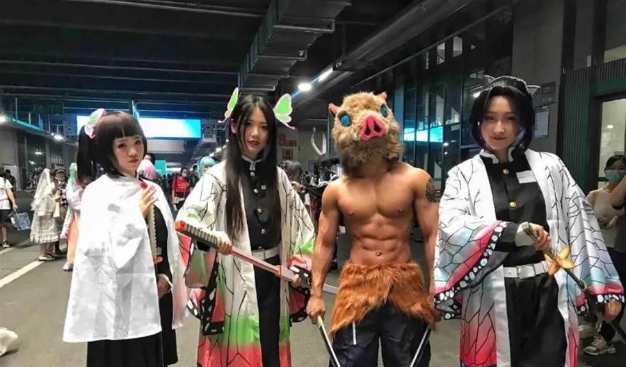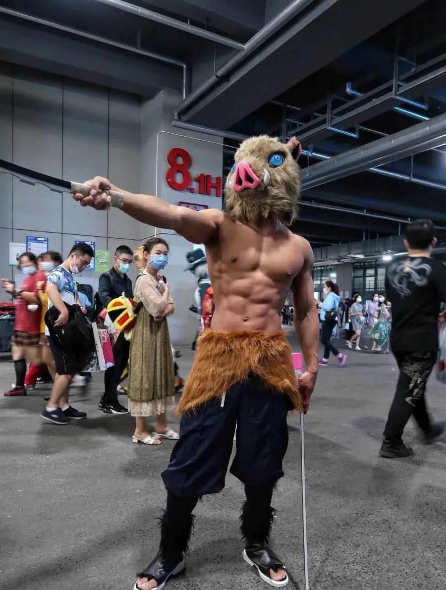 在漫展上cos了動漫《鬼滅之刃》裡的伊之助,由于身材太棒,回頭率爆棚。